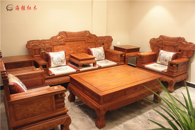 此實(shí)拍的寶馬沙發(fā)紅木家具圖片為7件套的,適合小戶家庭客廳擺放。
