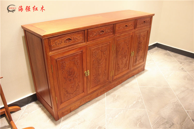 餐邊柜碗碟柜是放在餐廳空處或餐桌一邊具有收納功能的儲物柜,可以供放置碗碟筷、酒類、飲料類,以及臨時放湯和菜肴用,也可放置客人包小物件。名稱:四門四抽餐邊柜材質(zhì):非洲花梨/緬甸花梨尺寸:146*40*80cm下面2層,是連通的,可以放一些碗碟。古典風(fēng)格的銅配件。四塊前門板上有簡單的雕花。