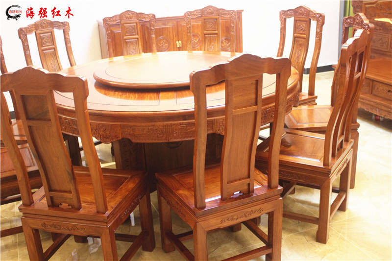 名稱:漢宮圓臺1.53米 ? ?餐桌+椅子 ?十一件套材質(zhì):緬甸花梨木家具尺寸:153*78cm/小轉(zhuǎn)盤85cm/椅子45*44*44*106cm/133*78cm十把椅子帶轉(zhuǎn)盤,中式設(shè)計+現(xiàn)代化結(jié)合雕刻有鳳凰圖,代表吉祥。座椅。椅把雕刻細(xì)節(jié)。桌子底部。??