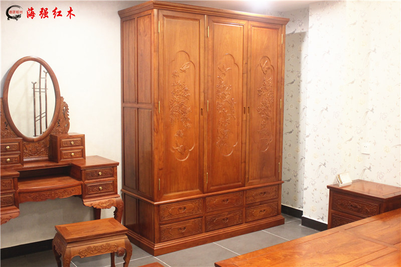 三門(mén)雕刻花鳥(niǎo)大衣柜緬甸花梨木尺寸:148*60*206cm臥室家具中式設(shè)計(jì)風(fēng)格。里面空間寬敞。下面還帶有六個(gè)大抽屜,儲(chǔ)物空間大。上面方便掛衣服。衣柜門(mén)上雕刻花鳥(niǎo)圖。(另外還有雕刻山水圖,和素面沒(méi)有雕刻的供您選擇)更多衣柜請(qǐng)點(diǎn)擊這里